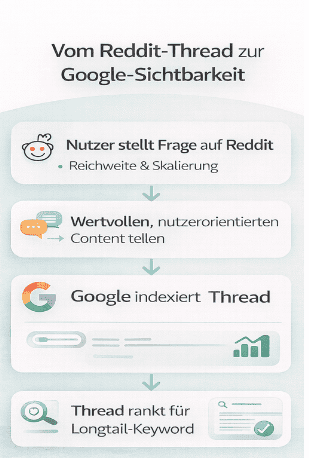 Schematische Darstellung, wie aus einer Reddit-Diskussion organische Sichtbarkeit in der Google-Suche entsteht (Quelle: chatgpt.com)