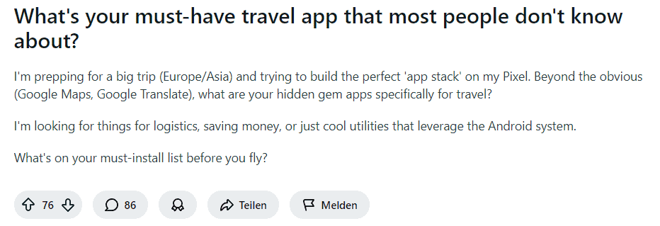 Reddit-Diskussion mit konkreter Nutzerfrage und praxisnaher Empfehlung aus erster Hand (Quelle: https://www.reddit.com/r/Android/comments/1oi5y9e/whats_your_musthave_travel_app_that_most_people/)