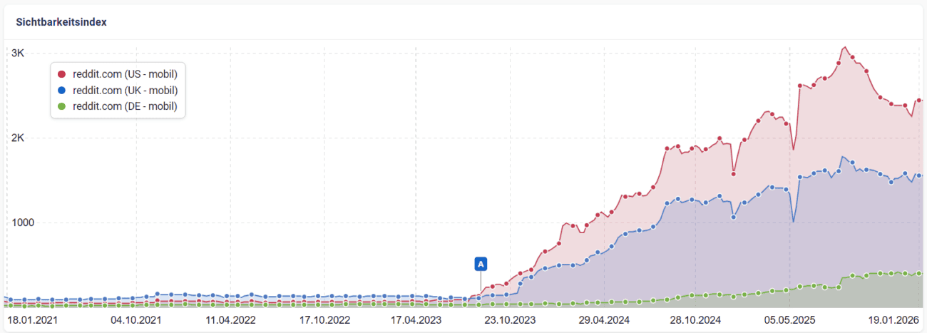 Entwicklung des Sichtbarkeitsindex von reddit.com (mobil) in den USA, UK und Deutschland seit 2021 (Quelle: sistrix.com)